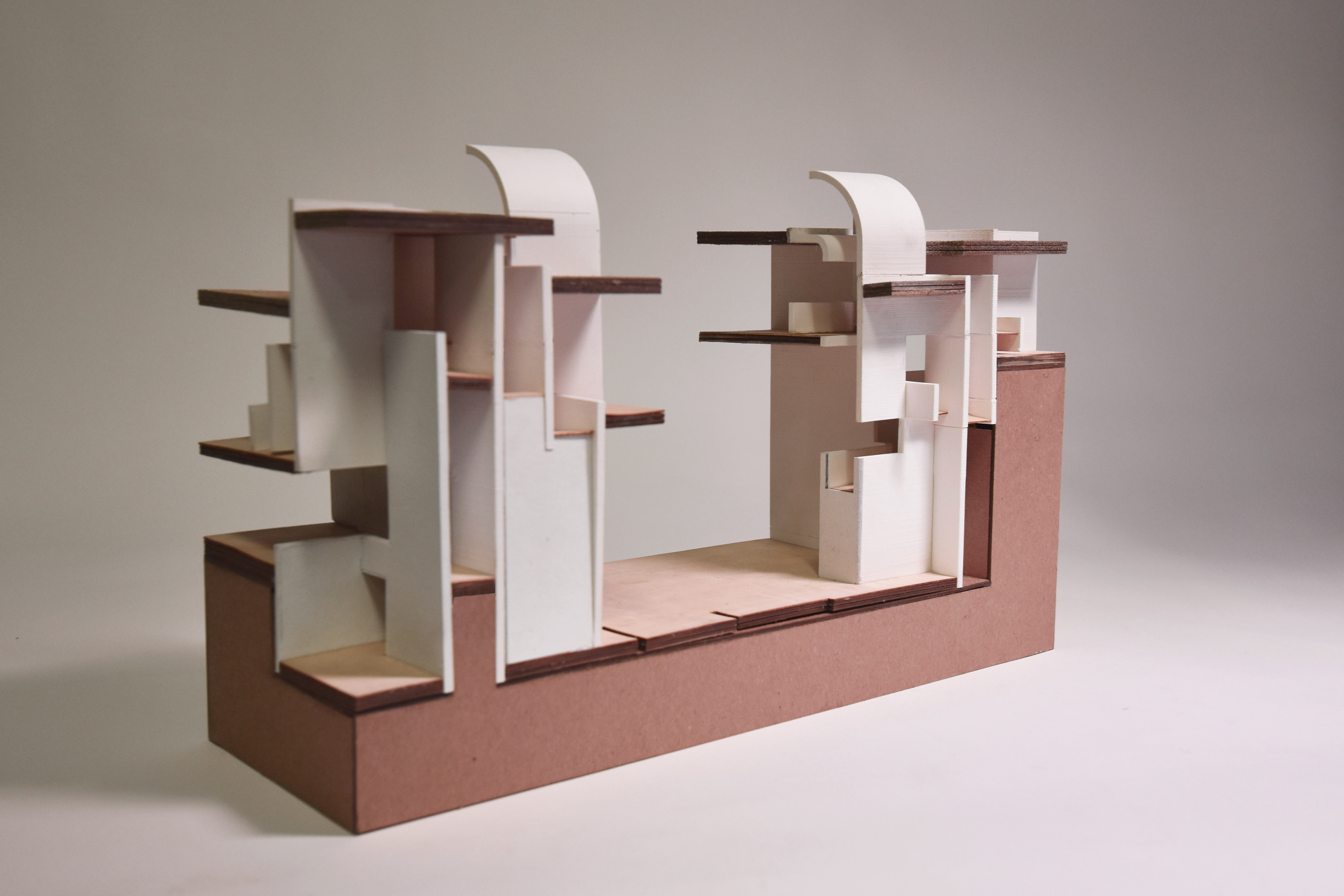 The below set of drawings explore program adjacencies across these nodes, allowing for related program to be connected without sharing a parti wall. Additionally, these collages identify the spatial resultants of these nodes. See captions for program cluster types.